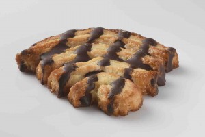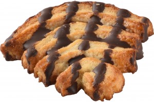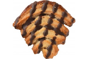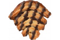 Producto en forma de corazón, de superficie plana , sabor dulce y con un pequeño baño de cacao, dibujando en la palmera rayas de cacao.