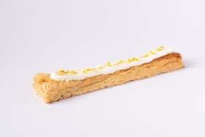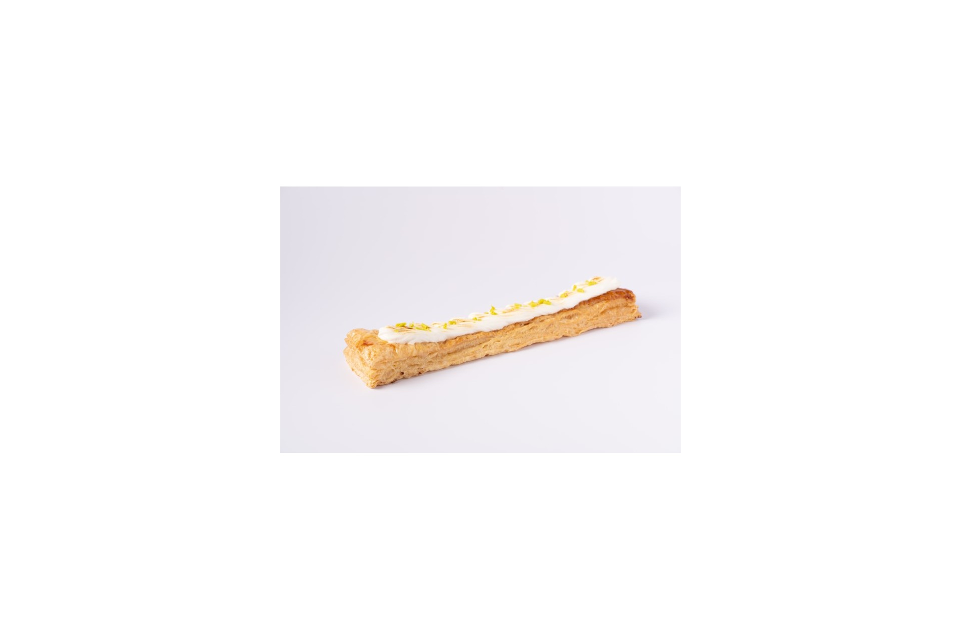 Pieza de pastelería rectangular de base hojaldrada rellena con un suave crema de merengue.