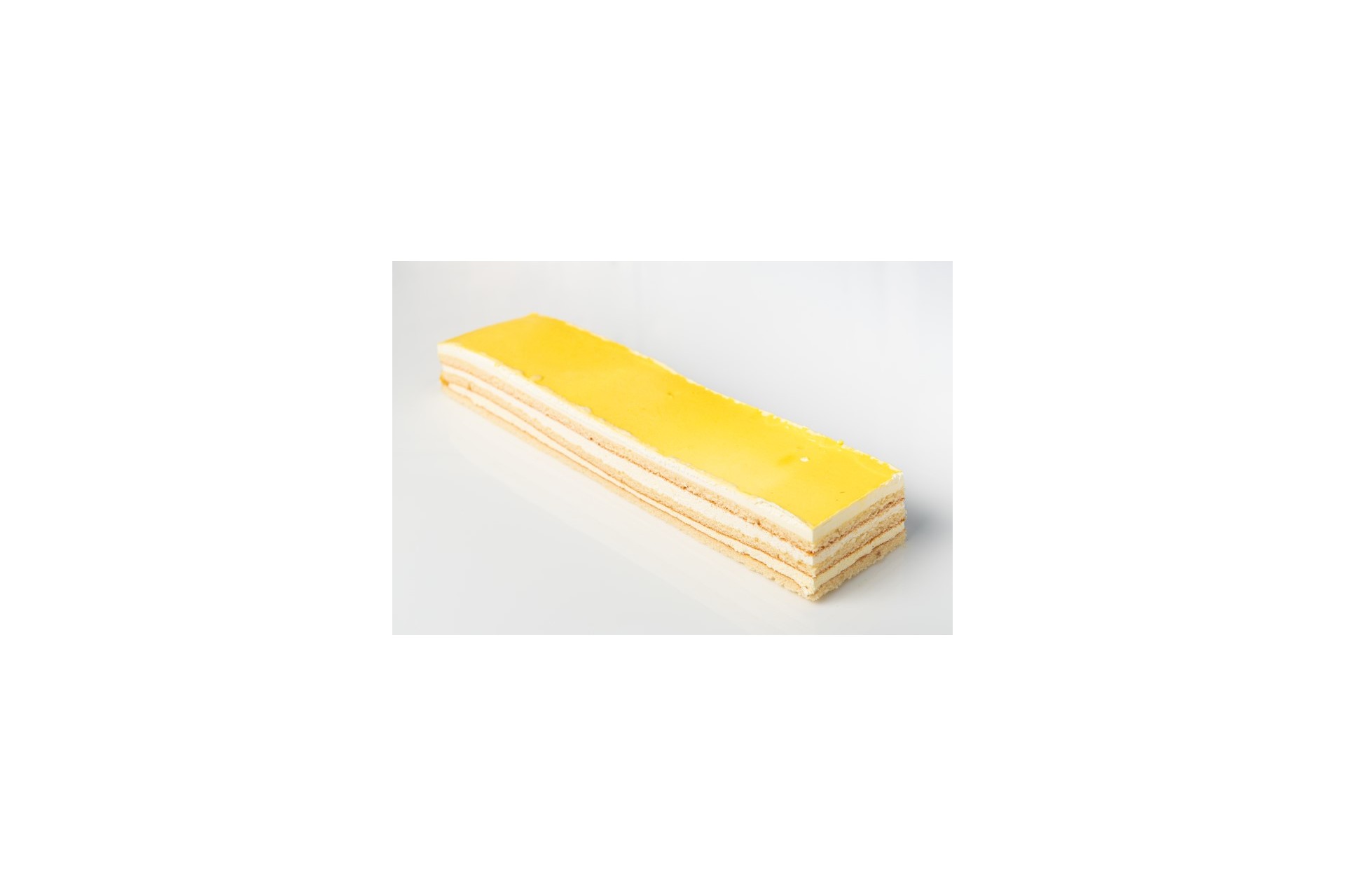 Pieza de pastelería multicapa, con forma rectangular alargada relleno extra con ligero sabor a maracuyá.