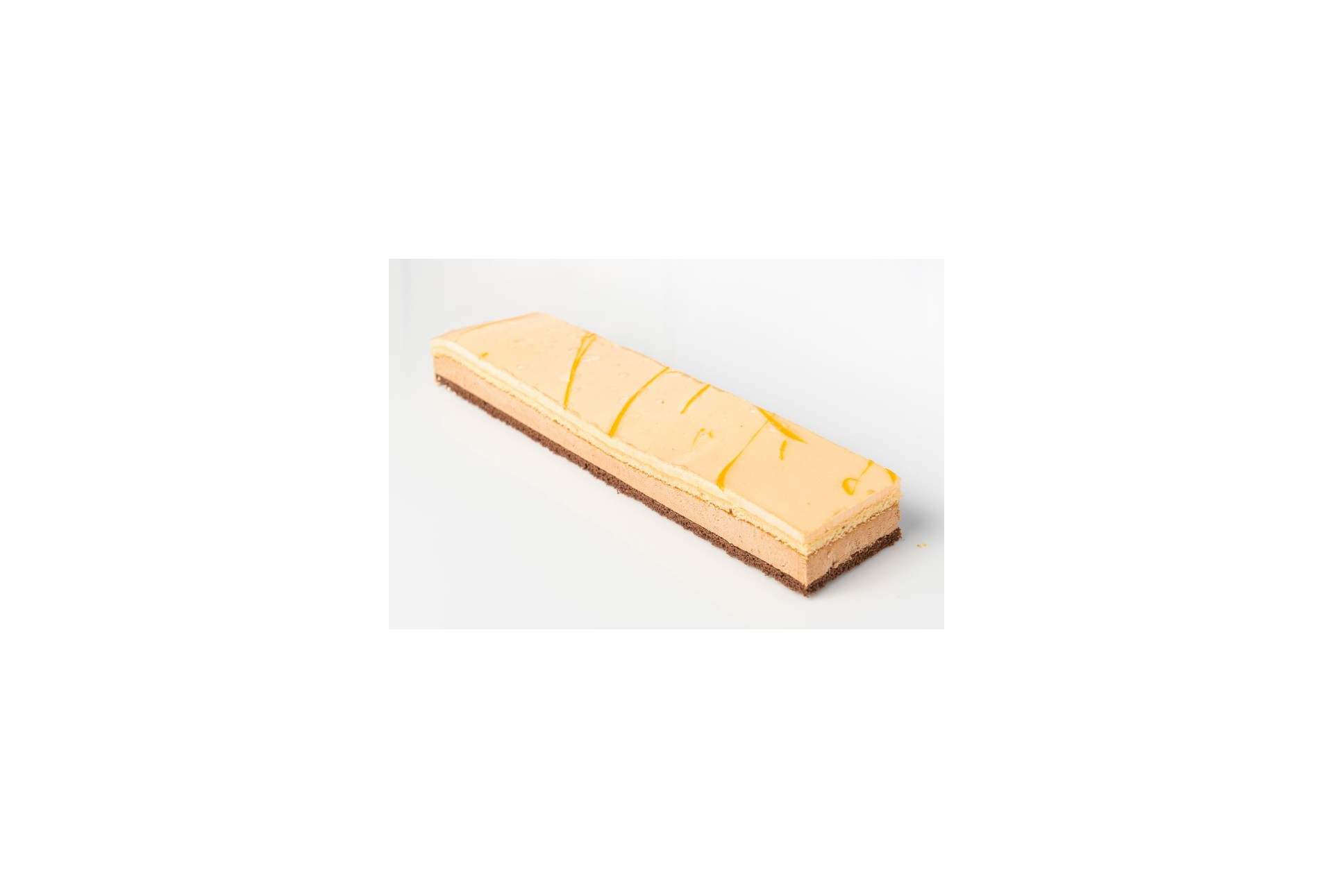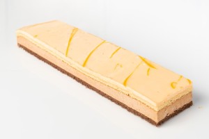 Pieza de pastelería multicapa, con forma rectangular alargada hasta una medida aproximada de 33 cm, relleno extra y contenido almíbar, caramelo, chocolate y cacao y aroma y sabor de naranja.