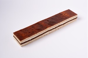 Banda alargada con capas visibles de bizcocho y relleno central de queso e higo; acabado brillante y uniforme.