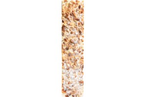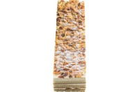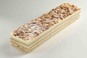 Pieza de pastelería multicapa, con forma rectangular alargada y contenido de almendra fileteada y nata.