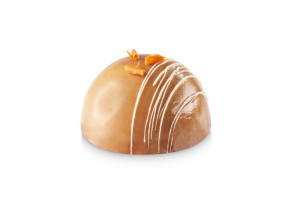 Semiesfera de mousse de avellana, recubierto con un baño espejo de chocolate con leche.
