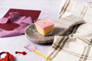 Postre en vasito, natilla cremosa con aroma de agua a agua de rosas y azahar, decorado en la capa superior por una cobertura de chocolate blanco de un color rosado pastel .