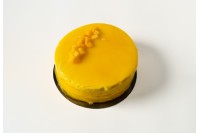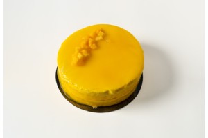 Producto de pastelería para eventos a base de bizcocho natural, crema de yogur y mango.