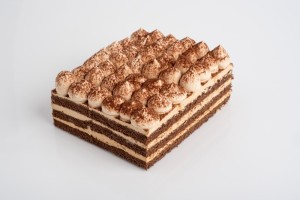 Pieza de pastelería en dos alturas elaborada a partir de dos planchas de bizcocho con un relleno de chocolate y café