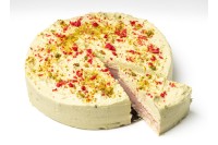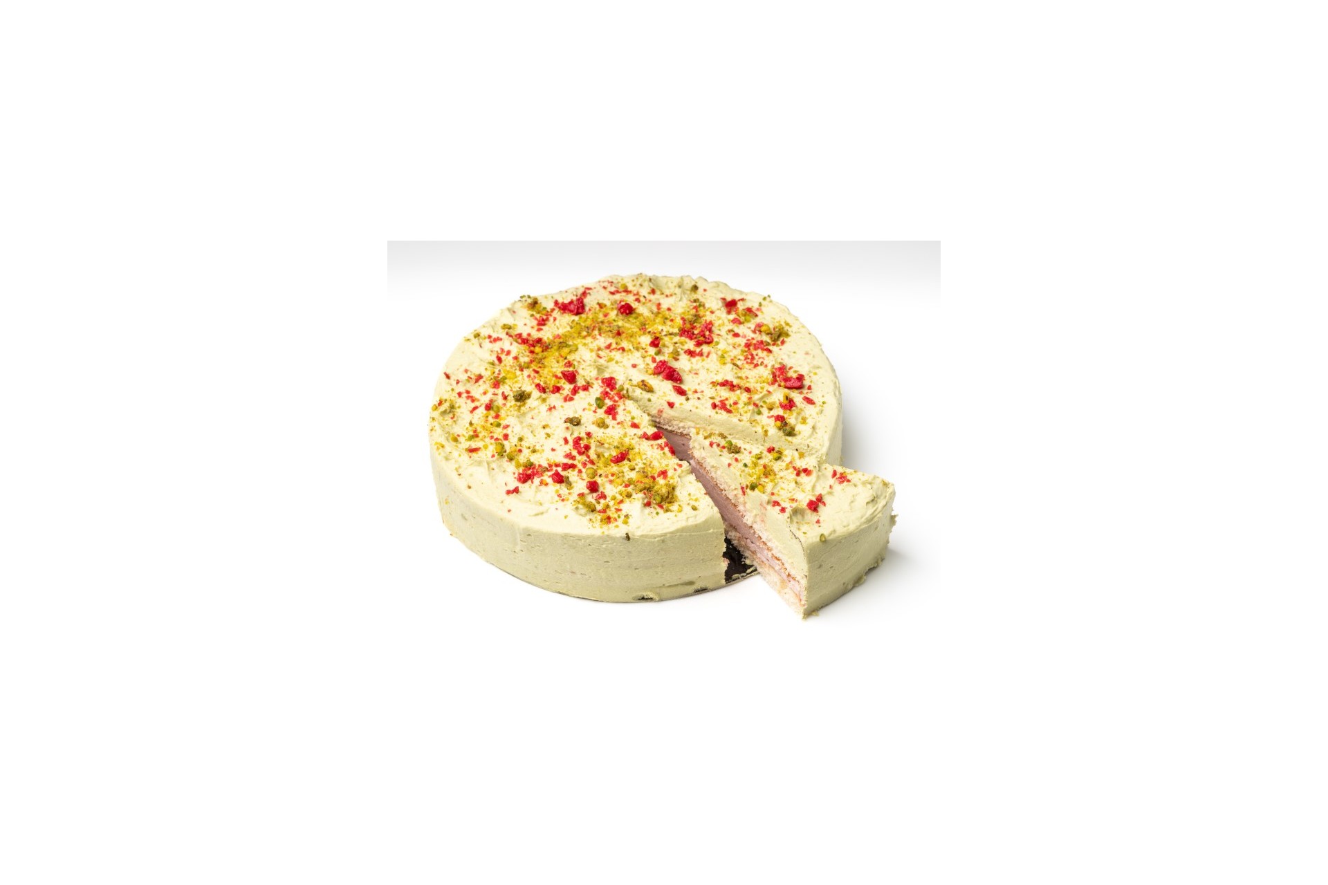 Tarta de color verde claro con trozos de frambuesa deshidratadas visibles.