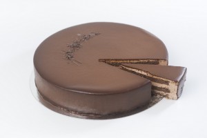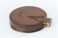 Pieza de pastelería en dos alturas elaborada a partir de dos planchas de bizcocho de chocolate con un relleno y acabado de natal con sabor a chocolate y bañada con chocolate.